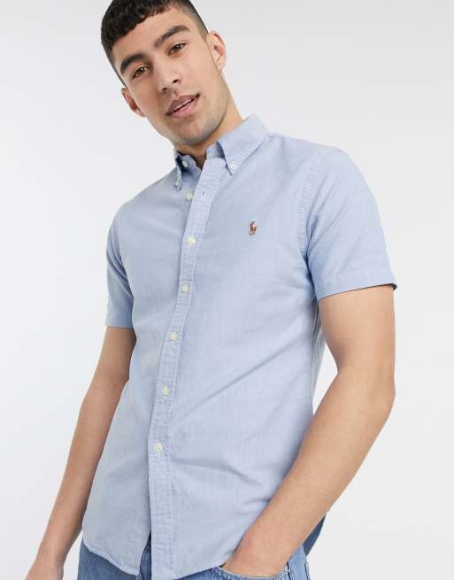 Polo Ralph Lauren Short Sleeve Oxford Shirt Slim Fit Multi Player Logo In Blue